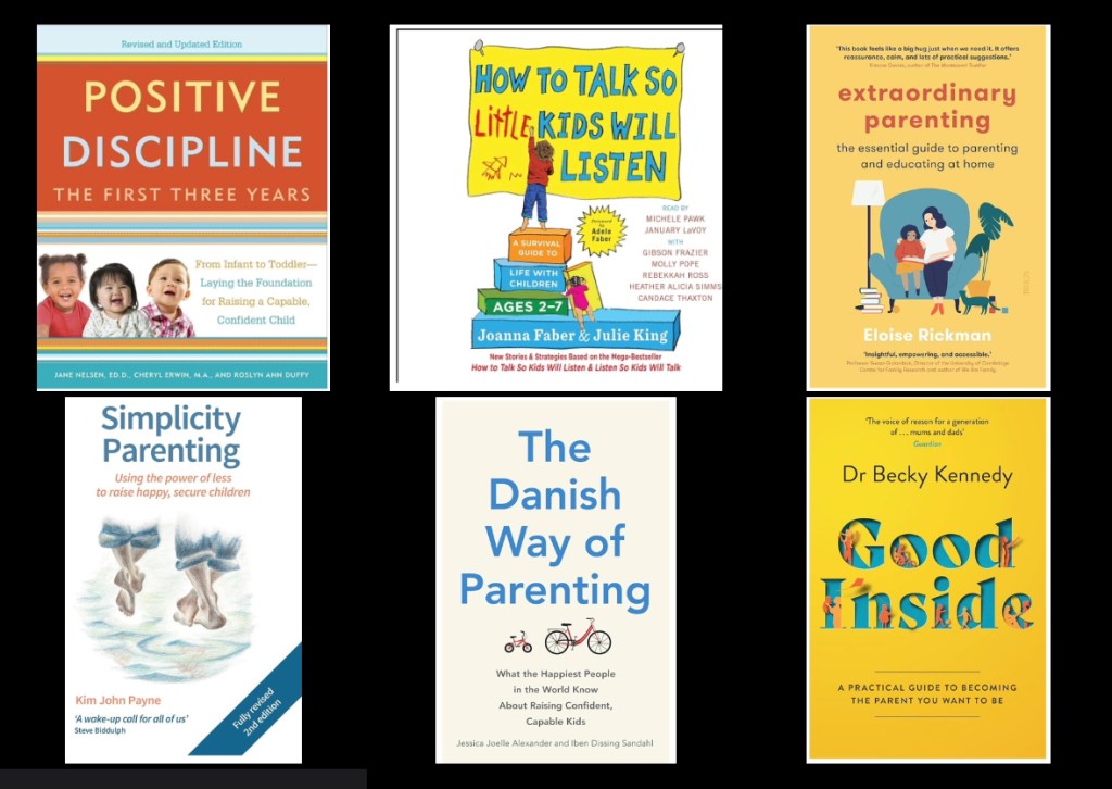 Links to purchase: Positive Discipline: The First Three Years by Jane Nelson, How to Talk so Little Kids will Listen by Joanna Faber and Julie King, Extraordinary Parenting by Eloise Rickman, Simplicity Parenting by Kim John Payne, The Danish Way of Parenting by Jessica Joelle Alexander and Iben Dissing Sandahl and Good Inside by Dr Becky Kennedy.