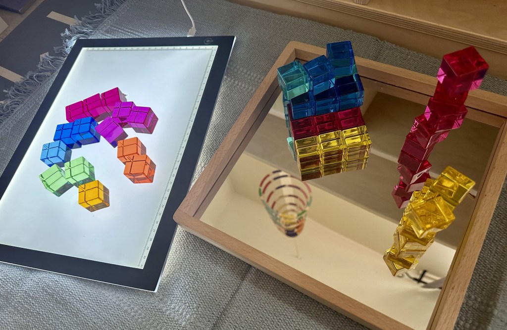 - Tickit gem cubes and mirror tray – This is a lovely set of 100 gem cubes. They look beautiful and inviting on the shelf. They can be used in various ways for colour learning and counting. You can also build and stack with them. They are also great for playing on the light box and mirror tray.