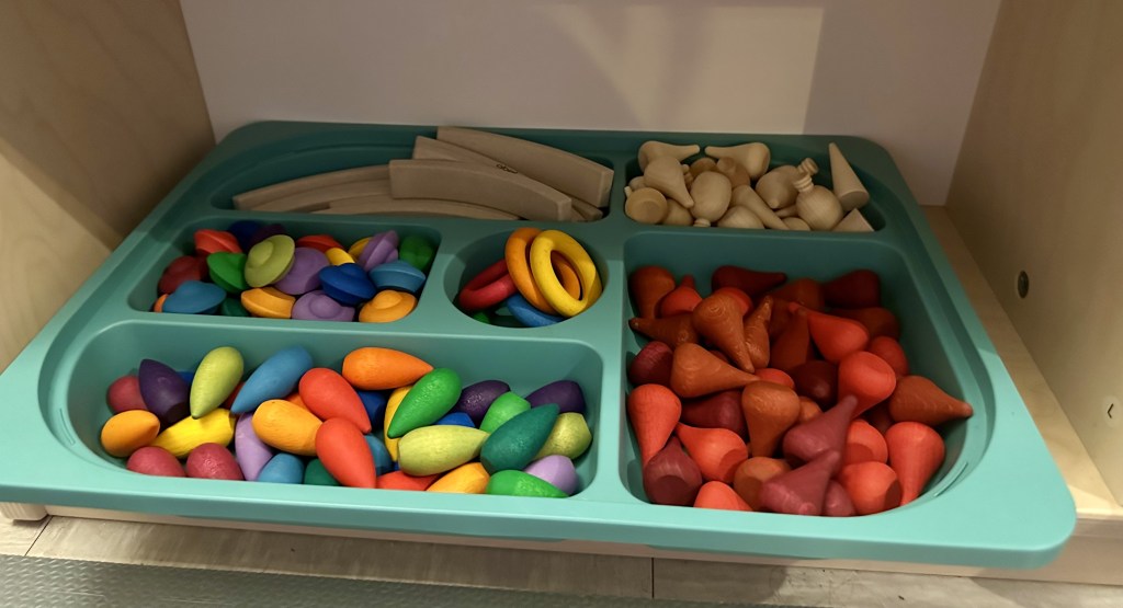 - A selection of Grapat mandala loose parts play pieces. I opted for the fire drops, rainbow flowers and rainbow snowflakes. I also used some of the Grimms rings and the Abel rewood mini block set.* I’ve put them all into an Ikea Trofast sorting tray to display on her shelf for her.