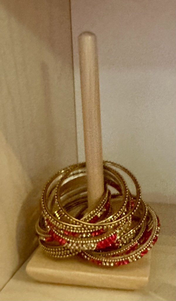 - Bangles on a dowel – a fun way to add a bit of Indian culture. I just slotted some Indian bangles onto the dowel of one of my toddler’s stackers. However, a kitchen roll holder will do just as well. Last year, she focused mastering the skill of placing the bangles onto the dowel. This year, she seems to prefer counting them as she puts them on.
